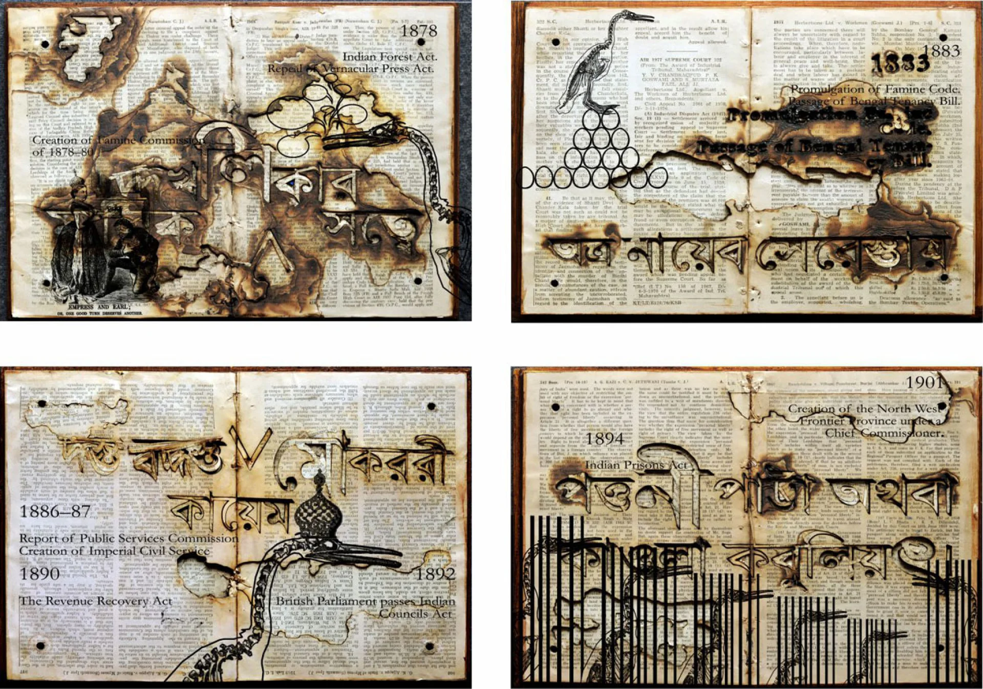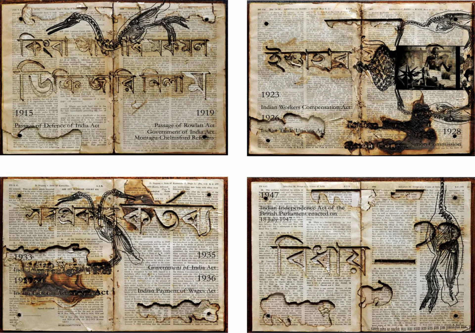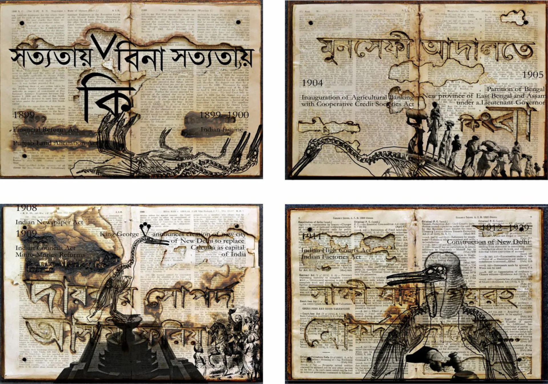 Chhatrapati Dutta has an eclectic manner of handling various mediums. His works are deeply rooted in academia and incorporate ideas of psychoanalysis through his works. His works present a juxtaposition of ideas rendered in a gyrating mass of collage. He deals extensively with memory through his works. The layers of the human mind are explored in his paintings. HE explores the print culture which often influences the human mind Archival prints, woodcuts, graphic novels are extremely enticing to the artist, thus. Dutta negotiates the personal experience/interaction with the world of print culture with his idea and concern over the global. Re-evaluation of the self against the long chain of history is perhaps a habit inherent in mankind. The artist reassesses the position the personal/self as set against the macrocosm of culture.