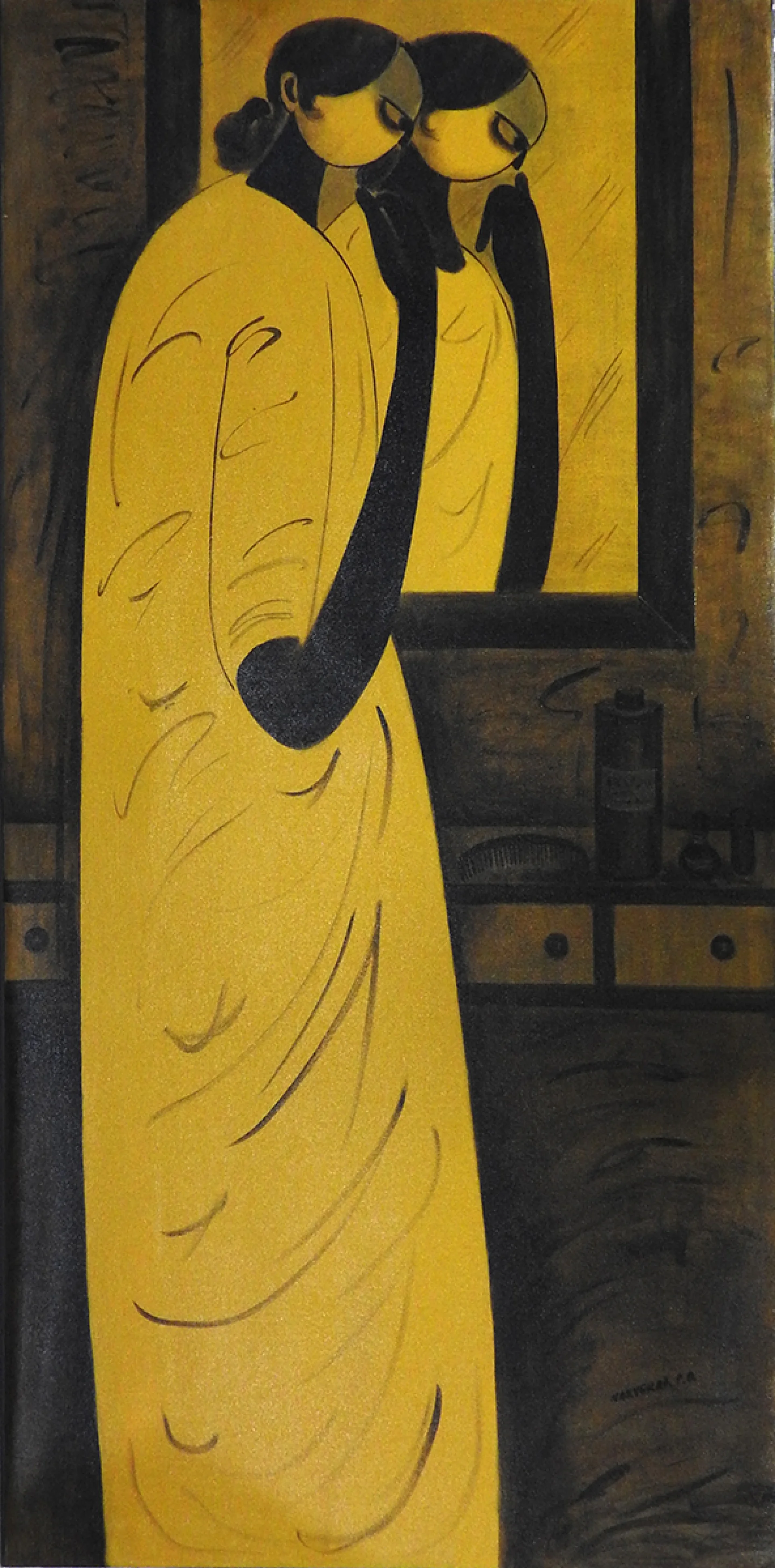One of Narvekar's most distinctive artistic signatures lies in his use of ochre and black as the primary colors in his monochromatic works. The juxtaposition of these hues symbolizes the duality of existence - the darkness and the light, the hardship and the hope, the despair and the resilience. The figures in his compositions, bathed in the contrasting tones of black and ochre, become embodiments of the human spirit, navigating the tumultuous waters of life with grace and fortitude.