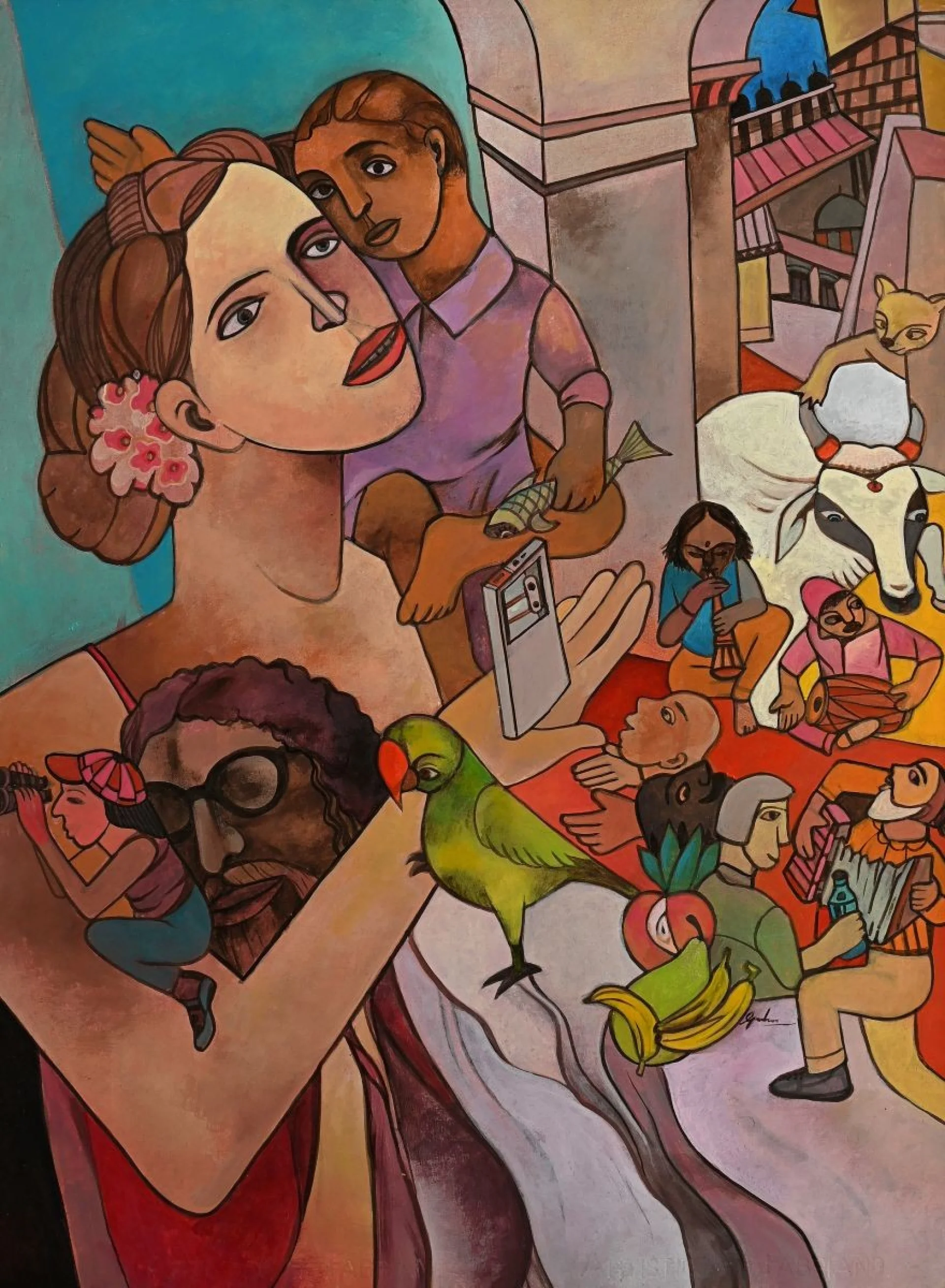 Gurcharan Singh is a distinguished Indian artist known for his deeply humanistic and visually rich portrayals of everyday life in India. A graduate of the Government College of Arts and Craft, Chandigarh (1973), Singh has spent over five decades developing a distinctive figurative style rooted in memory, observation, and a profound empathy for the marginalised. His paintings are populated by street performers, vendors, women, children, animals, and mythic figures, brought together in layered compositions that reflect the simultaneity of the sacred and the secular in Indian life.