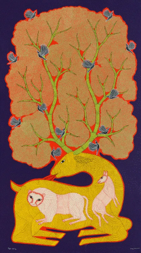 There are a lot of Gond rituals around trees, too. Once a year, we celebrate and offer our prayers to the Saja tree, which holds great importance in our culture. First, we anoint, propitiate and offer food to our gods and goddesses(mostly the food prepared from the new harvest), and then we have it as prasad. In addition, the knowledge of treatment through different parts of the trees, the use of different types of woods for different purposes like for instruments, plough, houses, etc… have been passed across generations, and hence, a reflection of the same is seen in our painting.