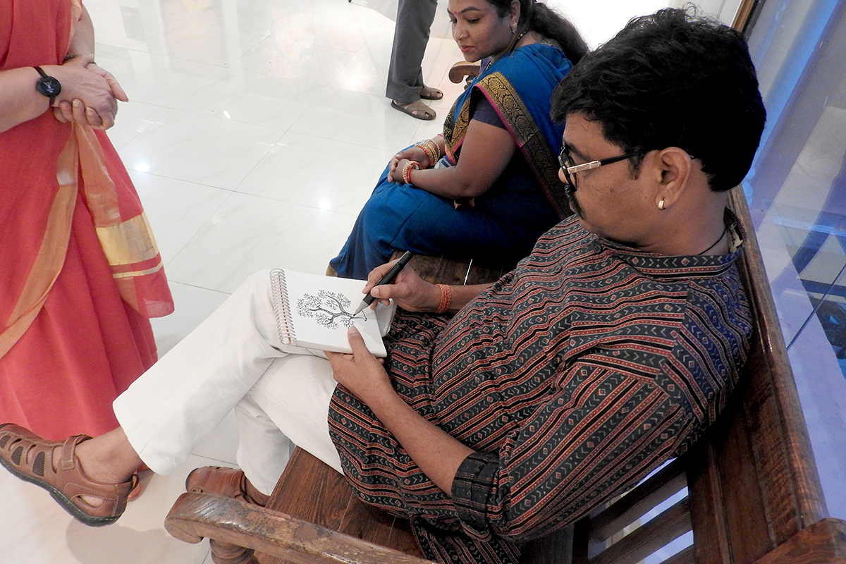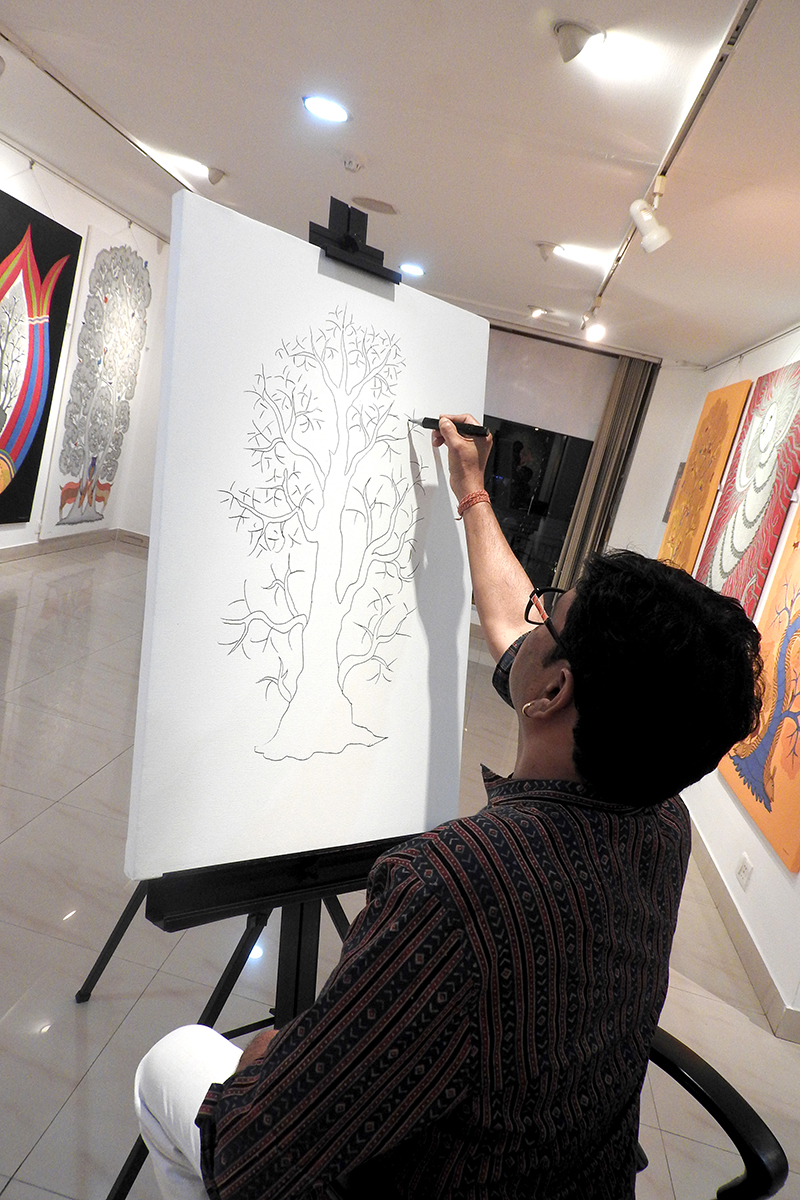 There are a lot of Gond rituals around trees, too. Once a year, we celebrate and offer our prayers to the Saja tree, which holds great importance in our culture. First, we anoint, propitiate and offer food to our gods and goddesses(mostly the food prepared from the new harvest), and then we have it as prasad. In addition, the knowledge of treatment through different parts of the trees, the use of different types of woods for different purposes like for instruments, plough, houses, etc… have been passed across generations, and hence, a reflection of the same is seen in our painting.